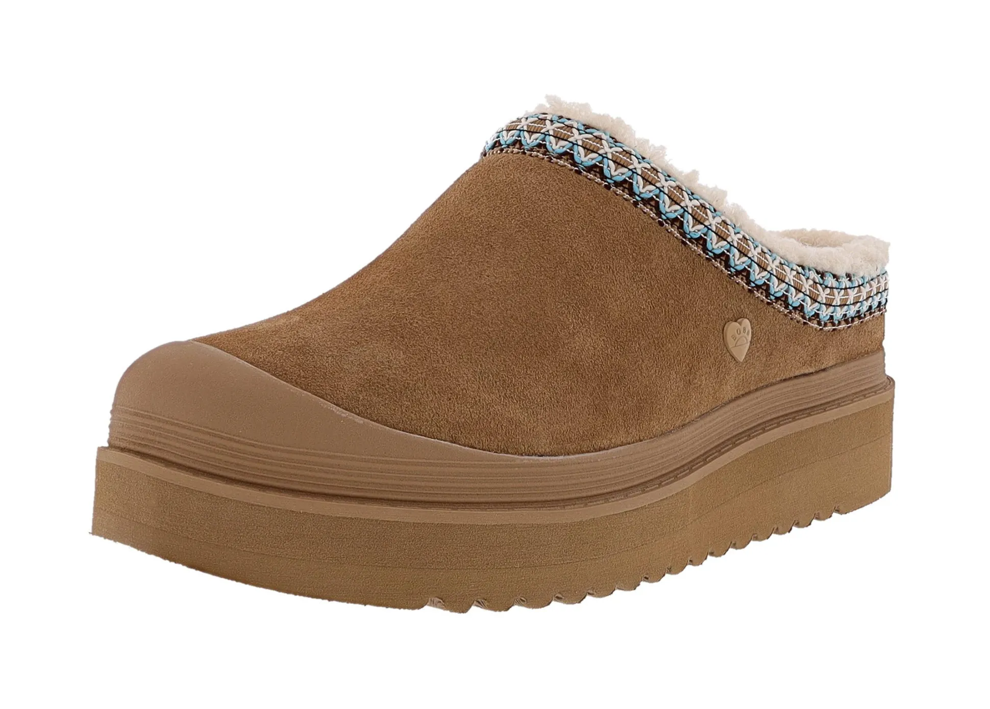 Treat your feet to chic comfort with BOBS from Skechers Dakota. This casual slipper clog features a 3M Scotchgard treated suede upper with faux shearling lining, intricate collar webbing, and a Skechers Memory Foam footbed for plush support.